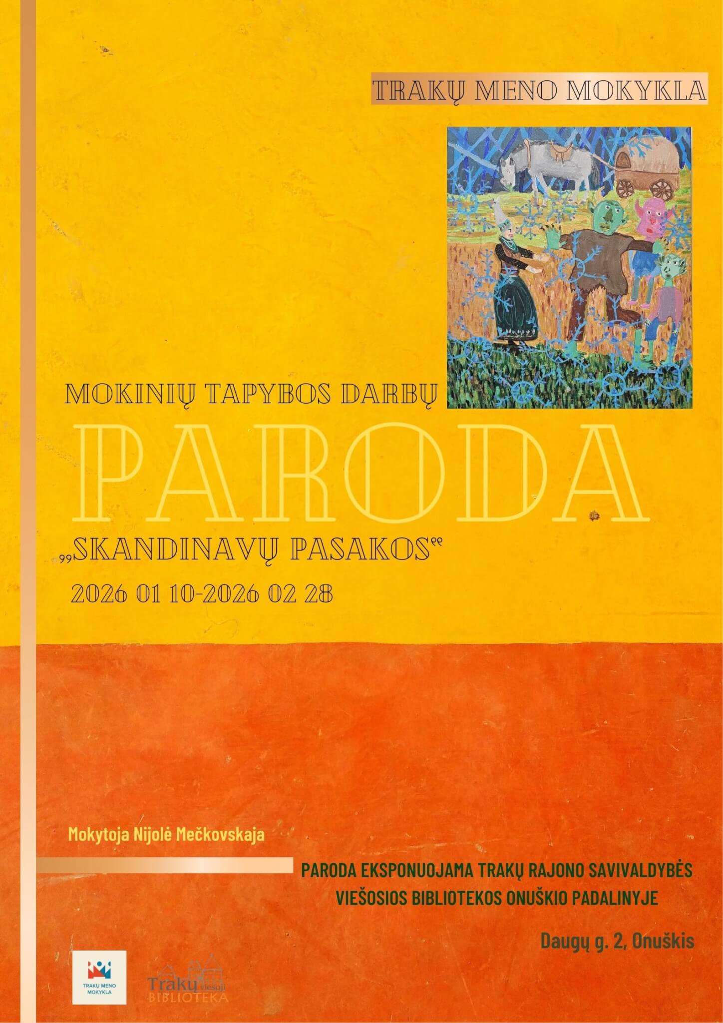 Onuškio bibliotekoje pristatoma IV-ojo projekto „Perskaityk knygą – sukurk iliustraciją“ paroda, skirta 2025 metų temai „Skandinavų pasakos“. Parodoje – mokinių iliustracijos, vaizduojančios trolius, milžinus, vikingus, skandinavų dievus ir kitus pasakų personažus.