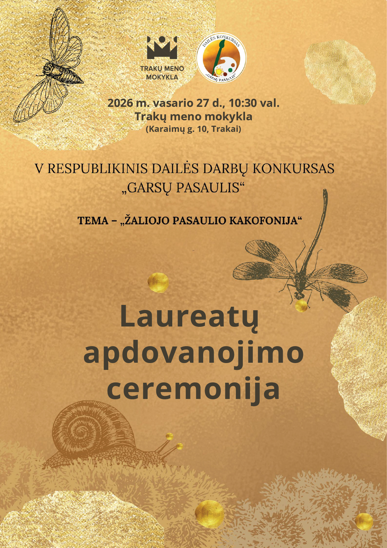 2026 m. vasario 27 d., penktadienį, 10:30 val. Trakų meno mokykloje (Karaimų g. 10, Trakai) vyks V respublikinio dailės darbų konkurso „Garsų pasaulis“ tema „Žaliojo pasaulio kakofonija“ laureatų apdovanojimo ceremonija.