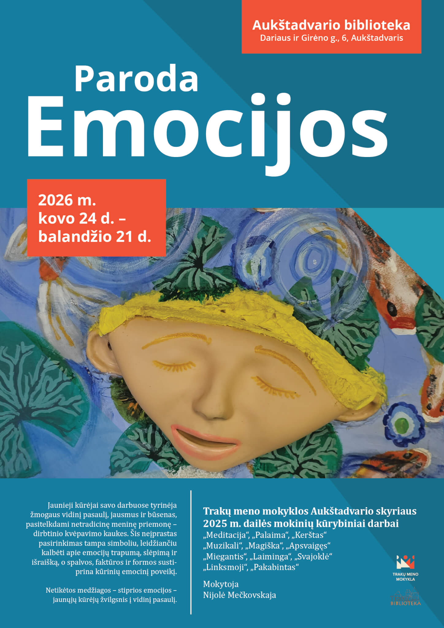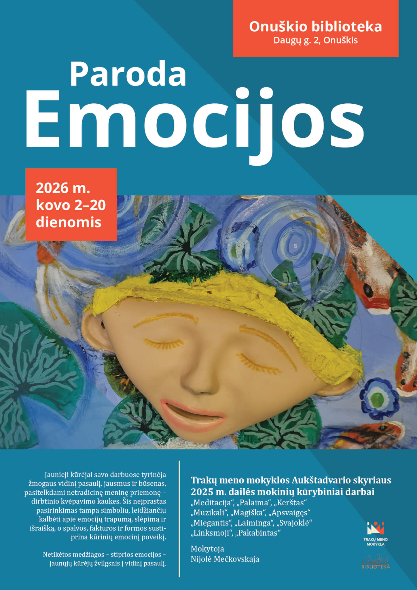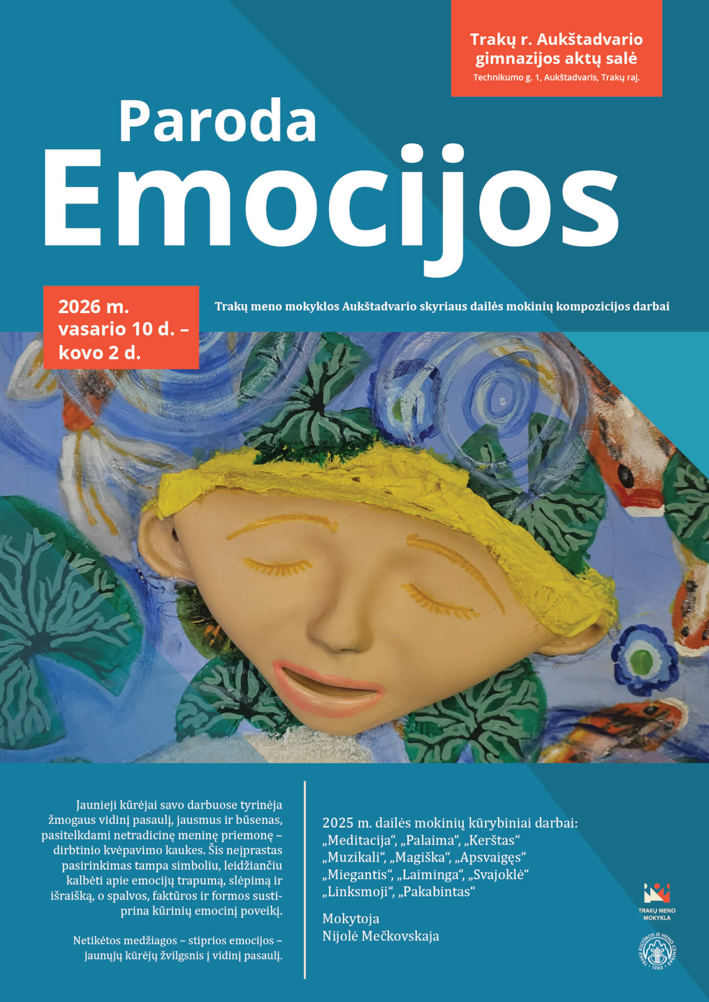 Jaunieji kūrėjai savo darbuose tyrinėja žmogaus vidinį pasaulį, jausmus ir būsenas, pasitelkdami netradicinę meninę priemonę – dirbtinio kvėpavimo kaukes. Šis neįprastas pasirinkimas tampa simboliu, leidžiančiu kalbėti apie emocijų trapumą, slėpimą ir išraišką, o spalvos, faktūros ir formos sustiprina kūrinių emocinį poveikį.
