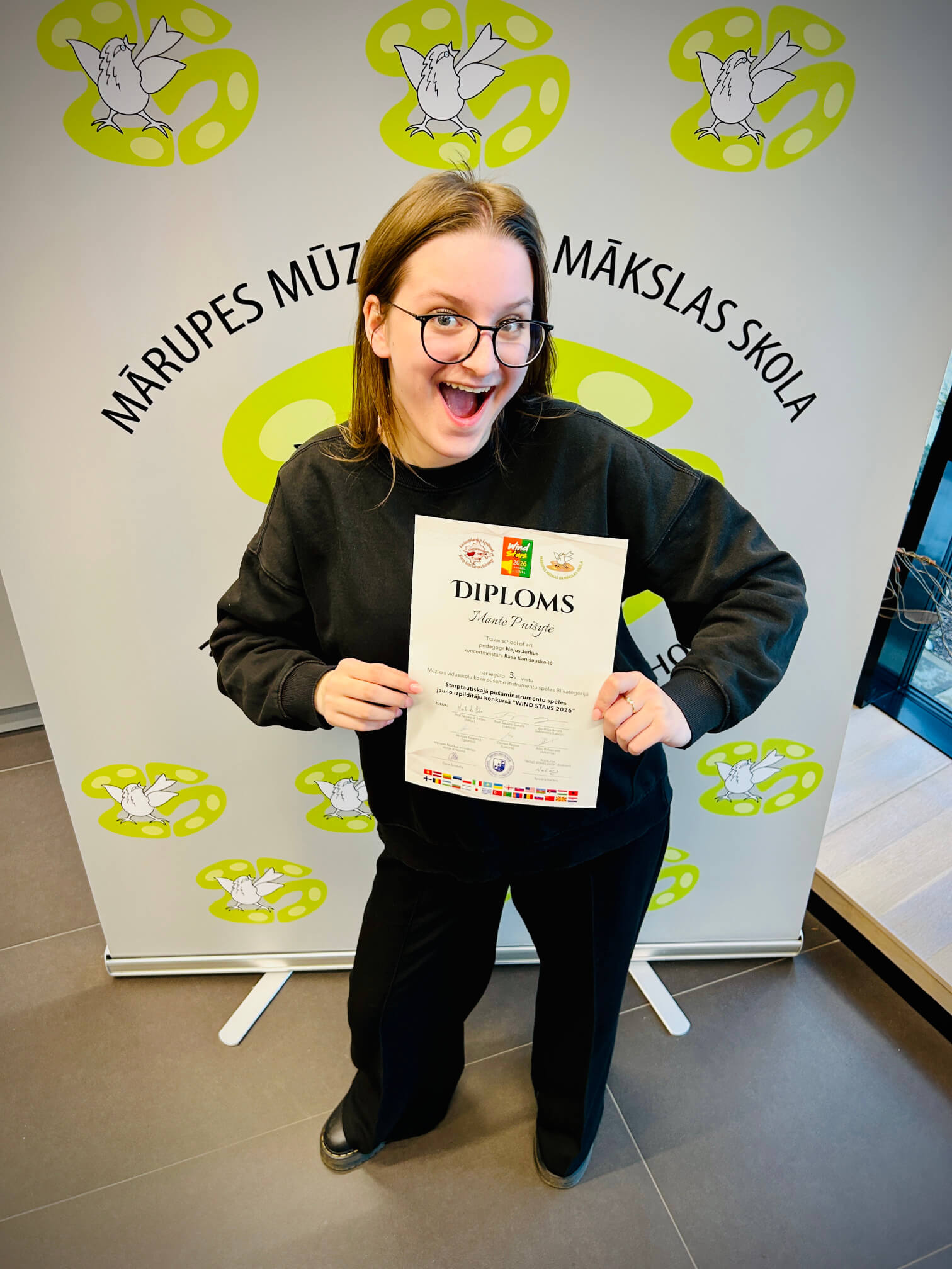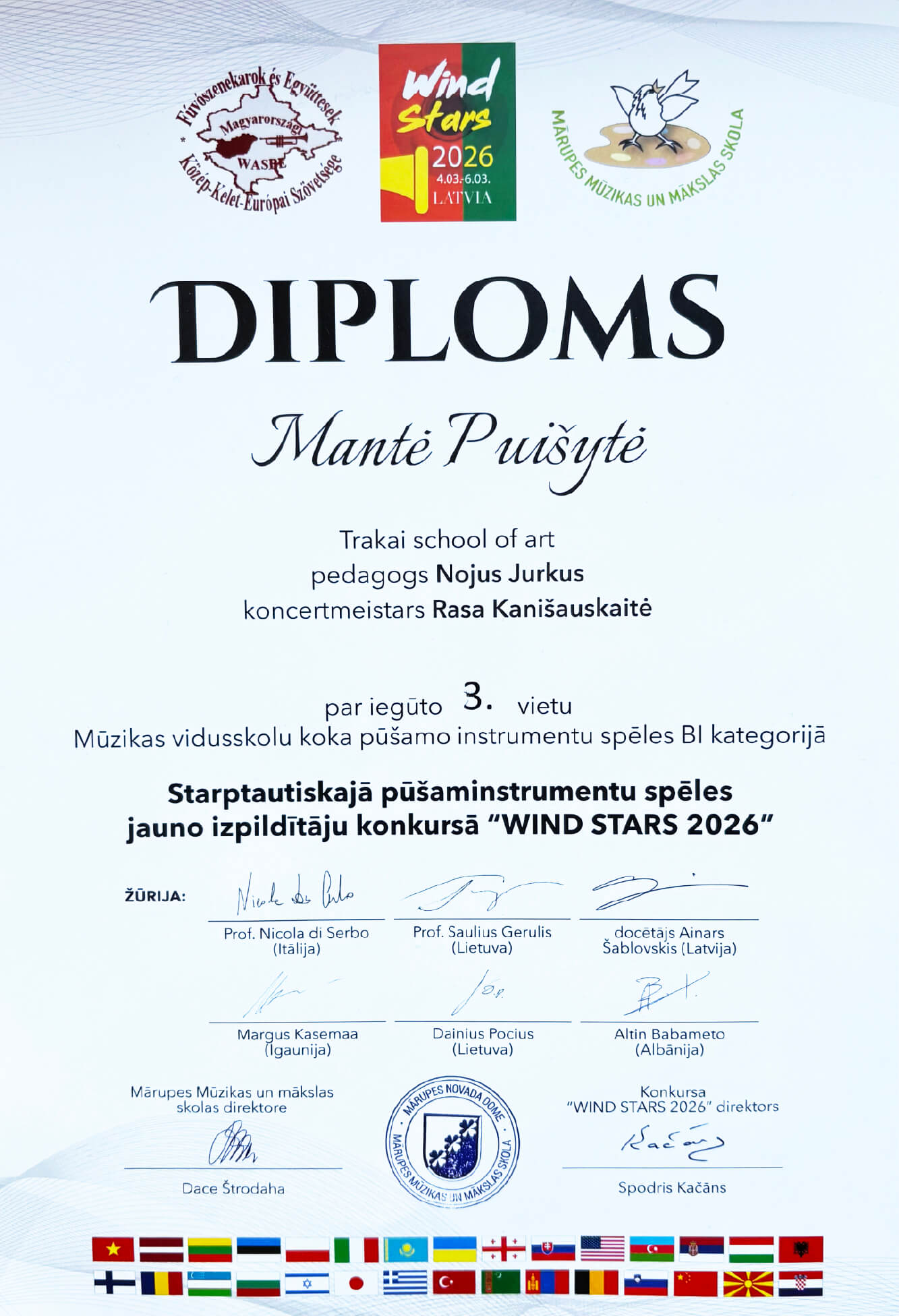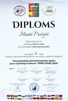 Puiki žinia iš Latvijos! Trakų meno mokyklos mokinė Mantė Puišytė (saksofonas) VII tarptautiniame jaunųjų pučiamųjų ir mušamųjų instrumentų atlikėjų konkurse „Wind Stars 2026“ pelnė III vietą!