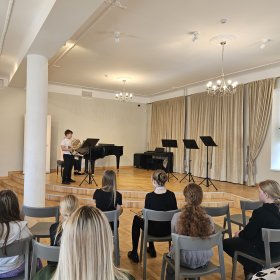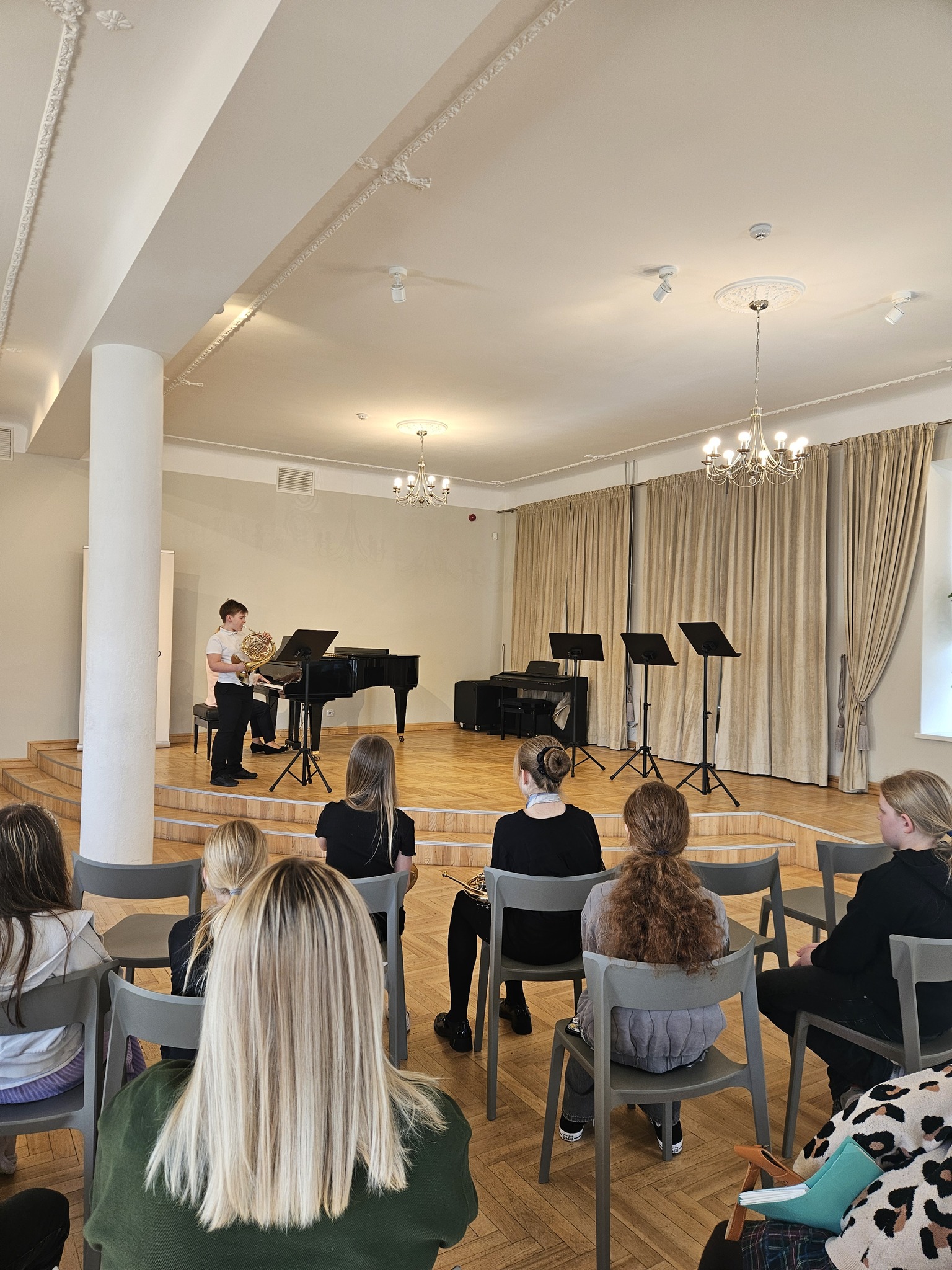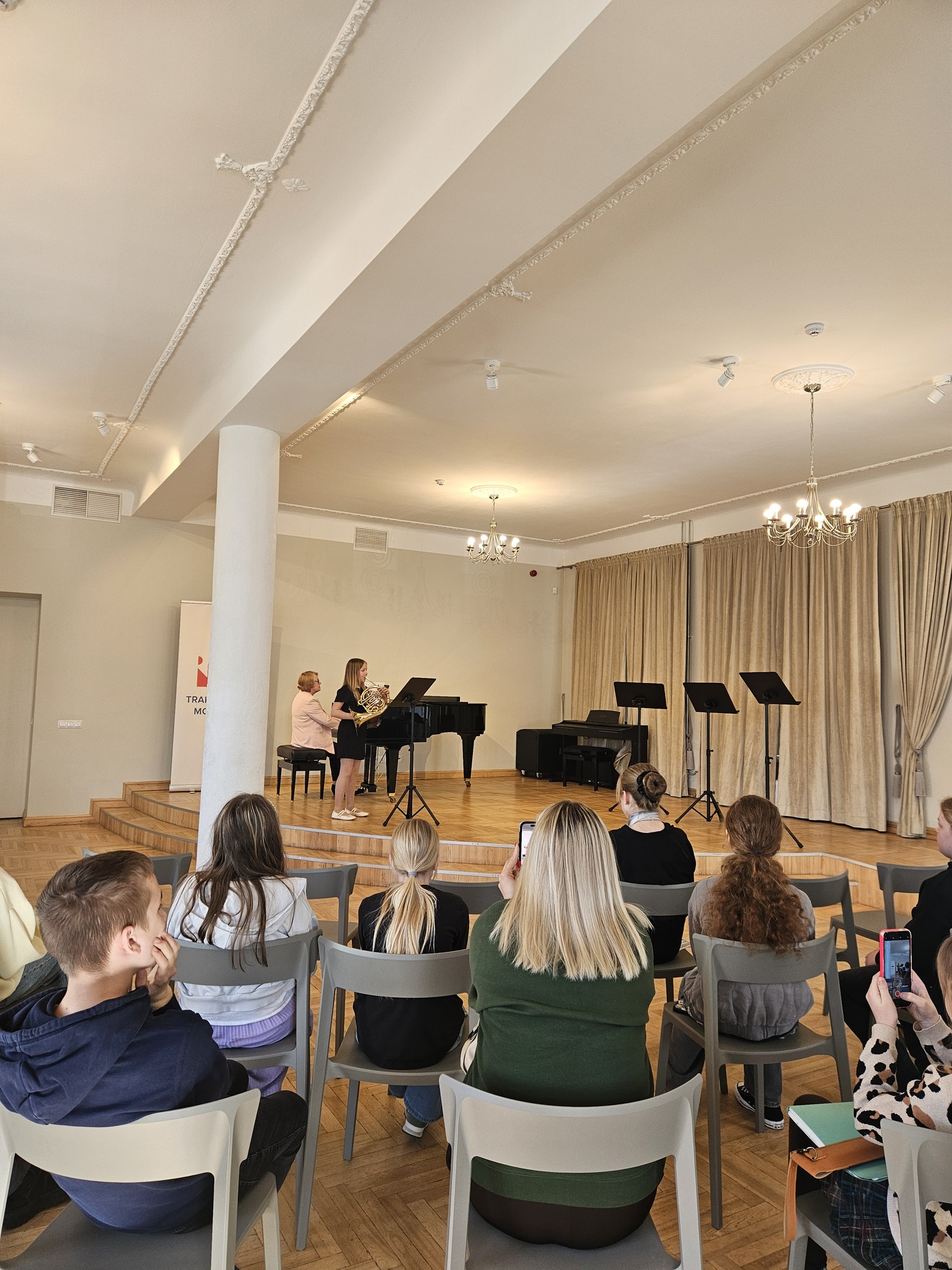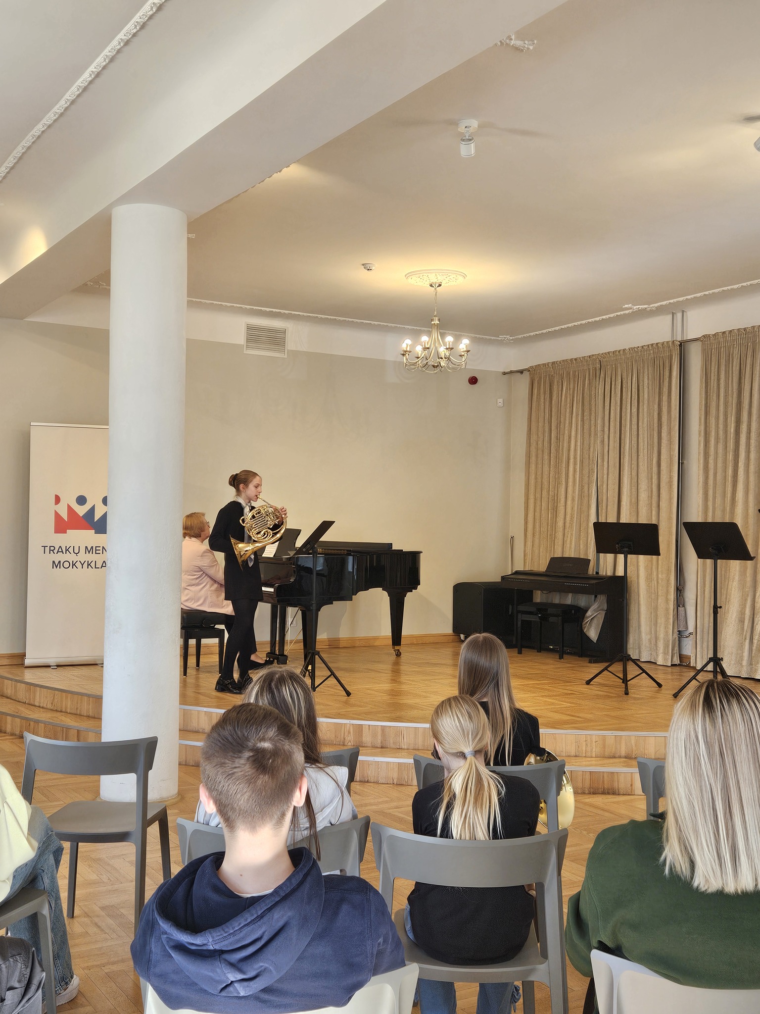 Scenoje pasirodė mokytojos metodininkės Indrės Kuleševičienės valtornos klasės mokiniai: Goda Rašimaitė (3 kl.), Gabrielius Stankevičius (3 kl.), Rytis Šalčiūnas (4 kl.), Andrėja Valytė (4 kl.), Aronas Ausėnas (5 kl.) ir Austėja Valatkaitė (6 kl.). Jauniesiems atlikėjams akompanavo pianistė koncertmeisterė Jovita Tumasonienė.